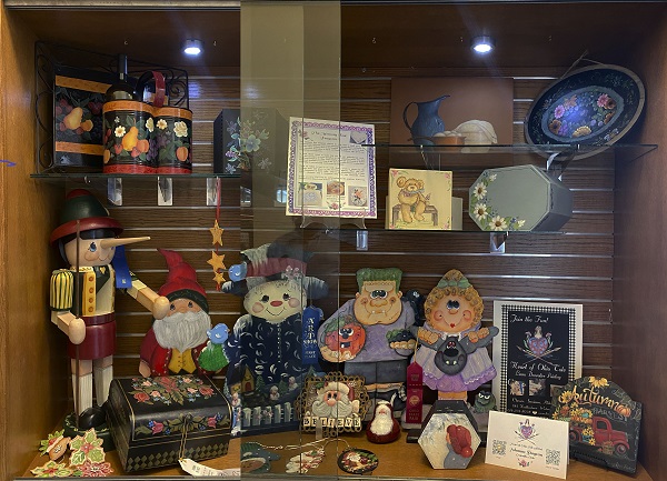 HOOT works with area libraries to promote decorative painting via display cases in the libraries. Our members will arrange various projects they have completed in the display cases along with information about HOOT. The displays are generally in the libraries for one month. The library patrons have the opportunity to see a variety of decorative painting examples. Memory boxes might also be included in the displays.