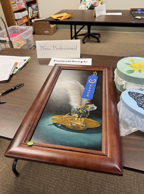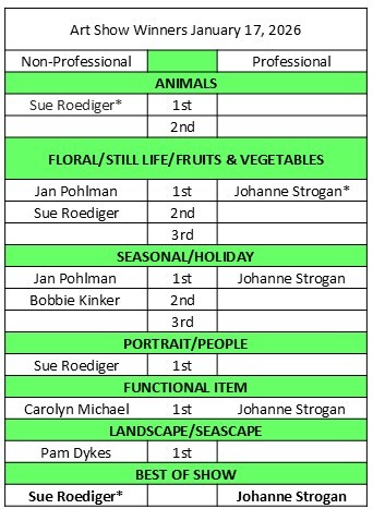 Members are invited to bring items to enter in the January Art Show. We have the HOOT members vote on the 1st, 2nd and 3rd place ribbons. The Best of Show is decided by the judges. Th Best of Show winners also receive a gift card. All entrants receive a free brush.